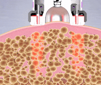 Start seeing results within 2 weeks! Suction is applied to skin naturally disrupting fat cells andbreaking connective tissue, thus reducing the bands causing dimpling